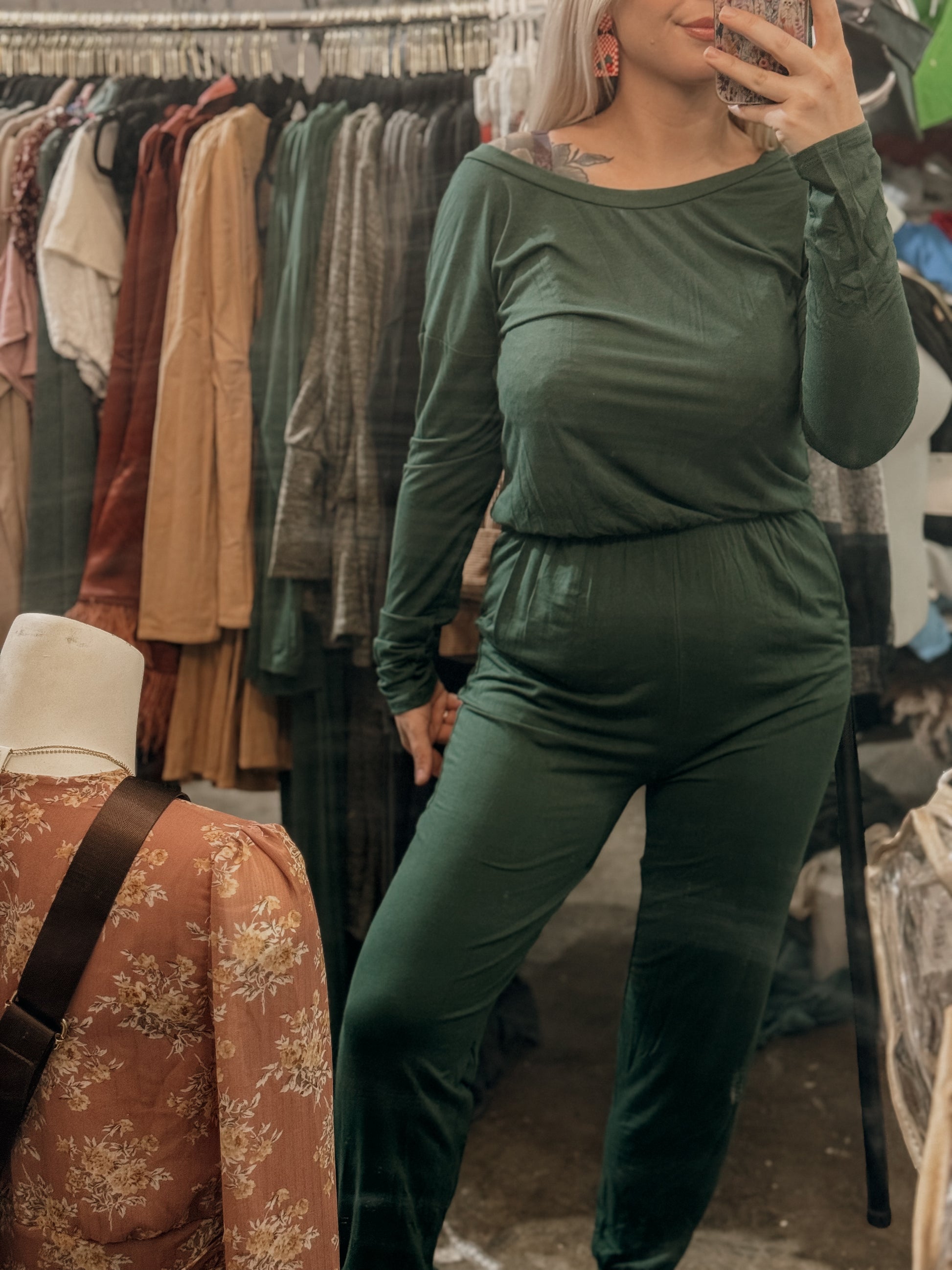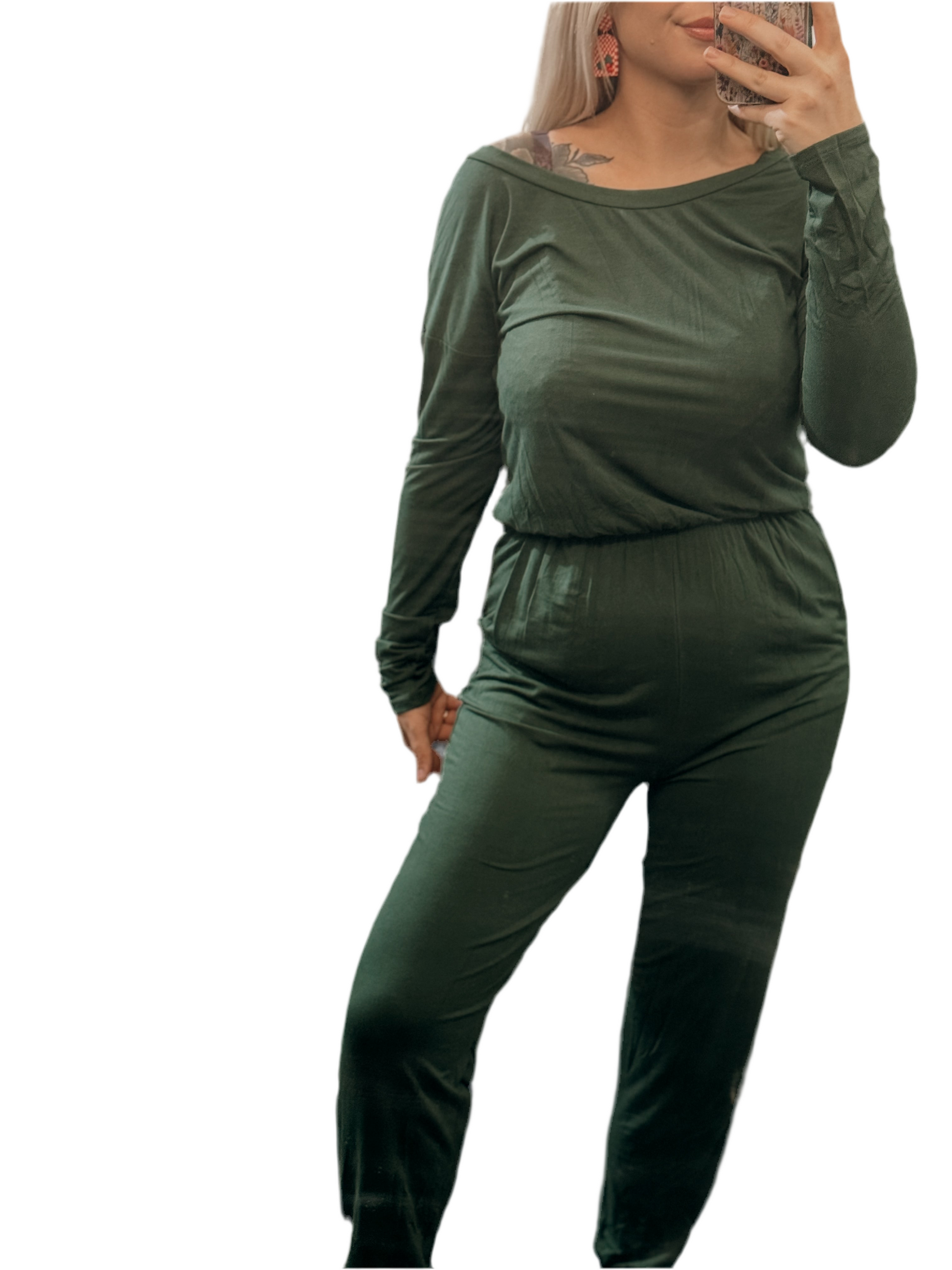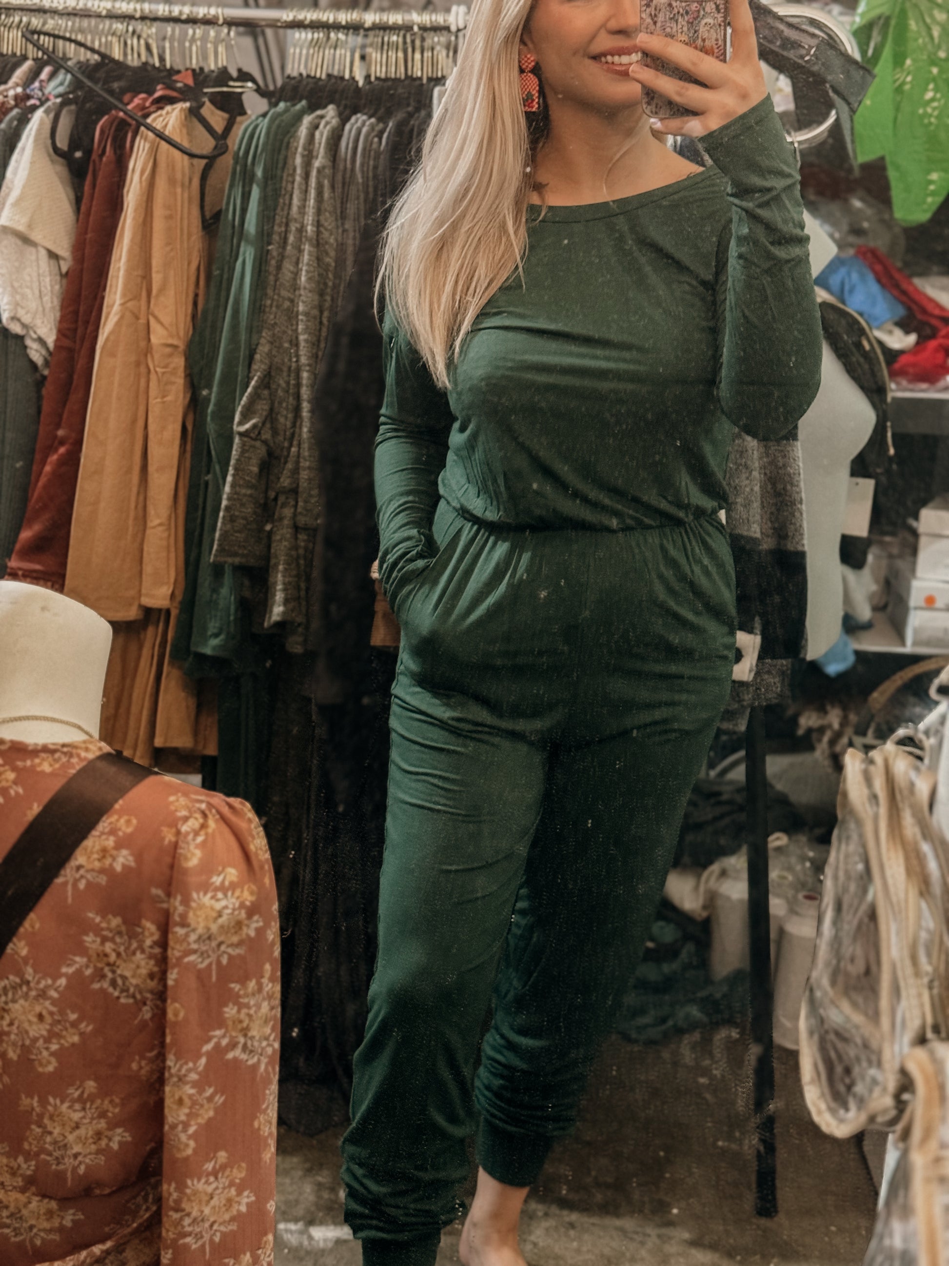 a forest green elastic waist jumpsuit featuring pockets and a material you will want to live in!