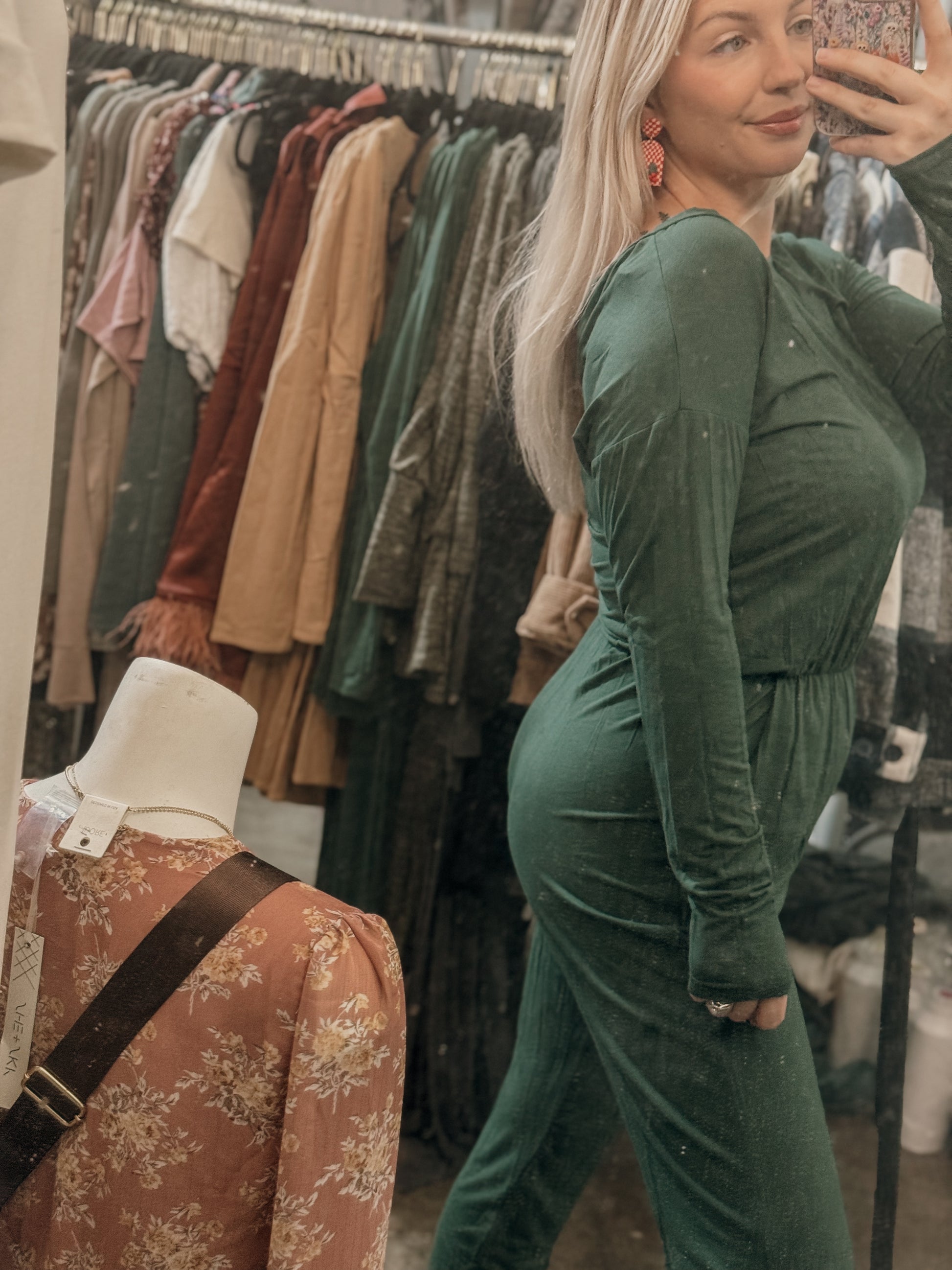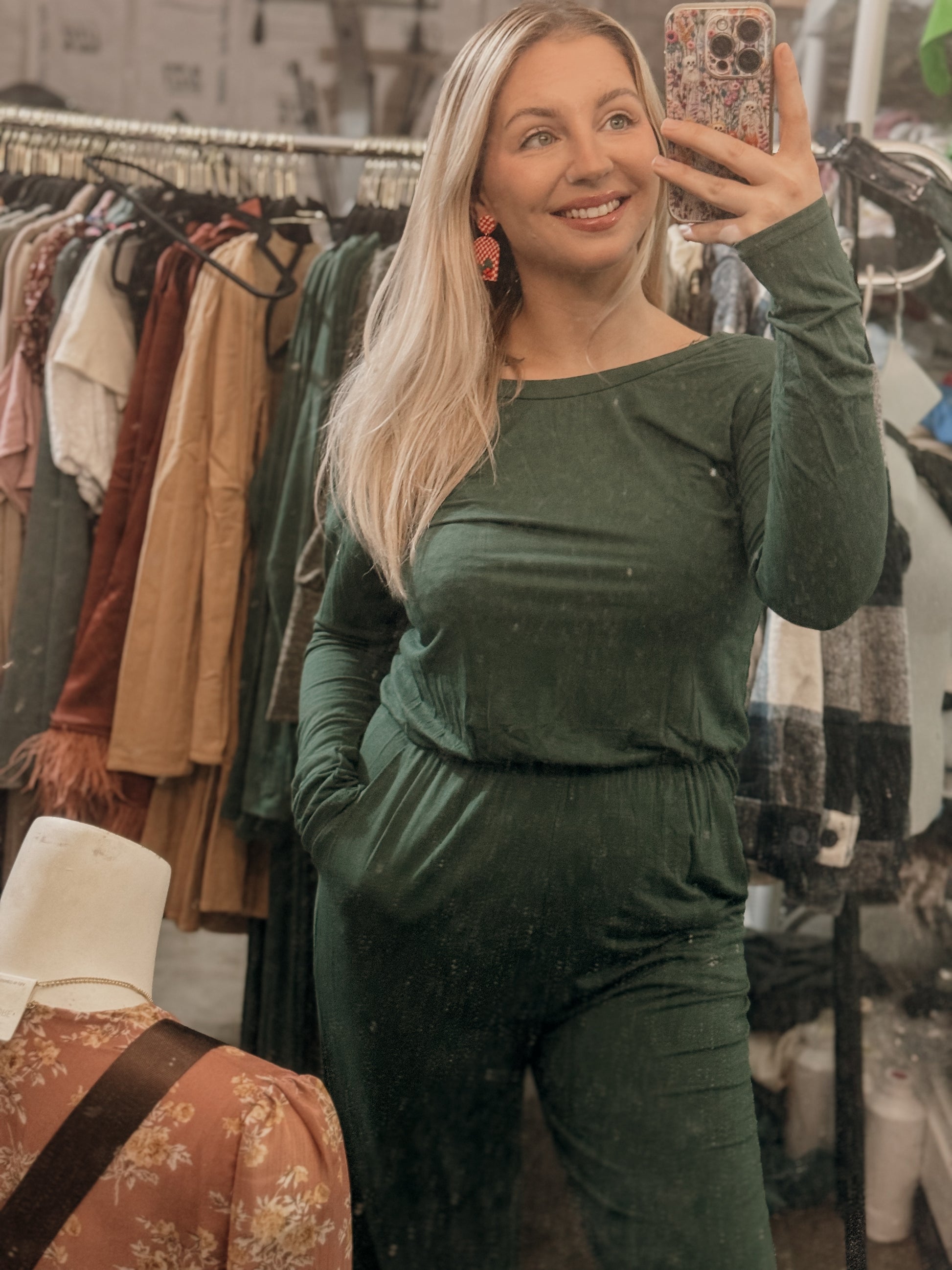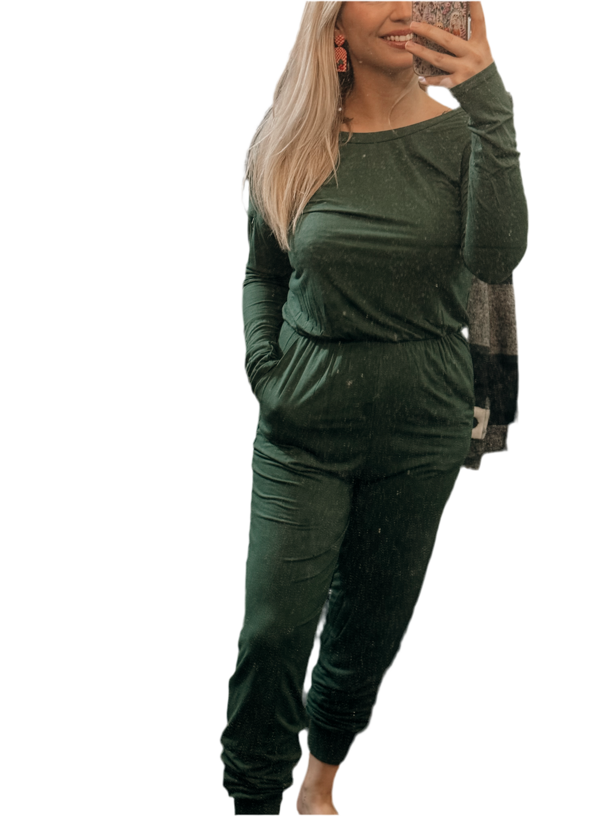 a forest green elastic waist jumpsuit featuring pockets and a material you will want to live in!